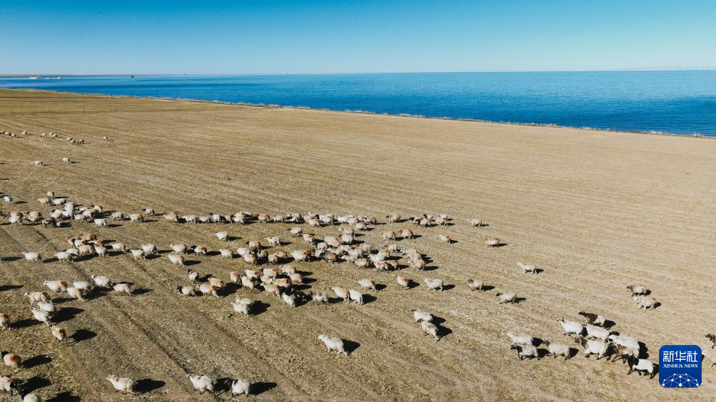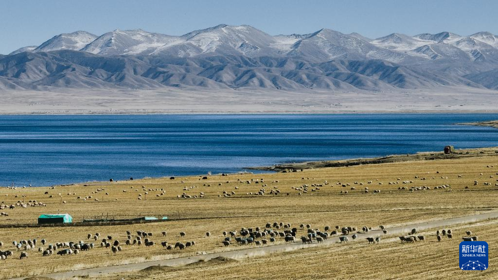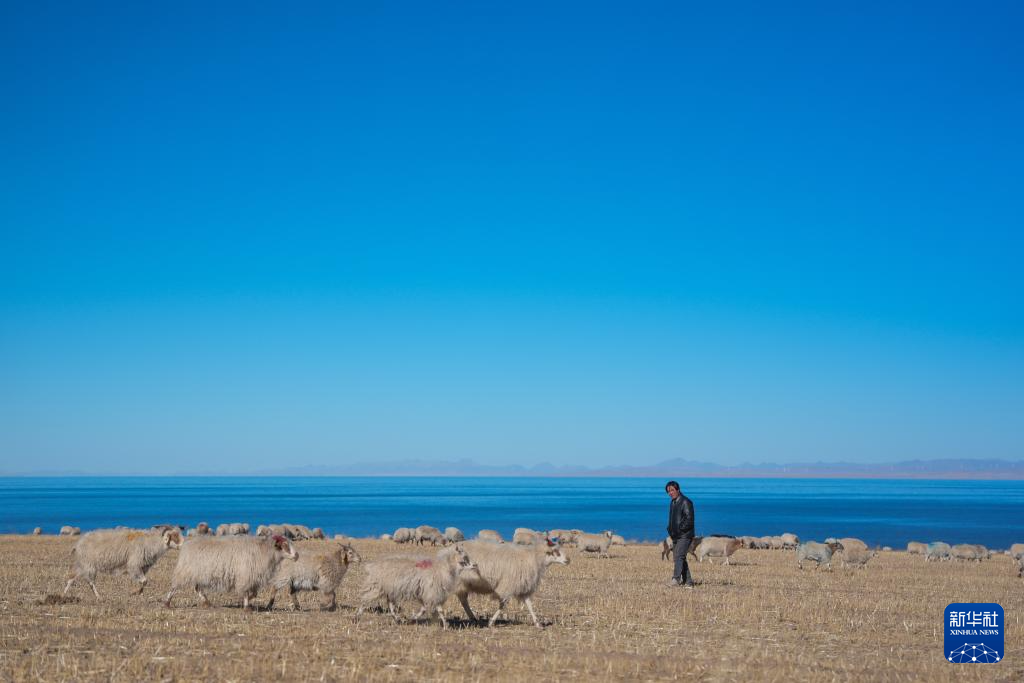 冬日,在青海省海南藏族自治州共和縣江西溝鎮(zhèn)附近的青海湖湖畔,牧民趕著羊群在這里放牧,湛藍(lán)的湖水與羊群相映成景,繪就一幅冬日牧羊圖。