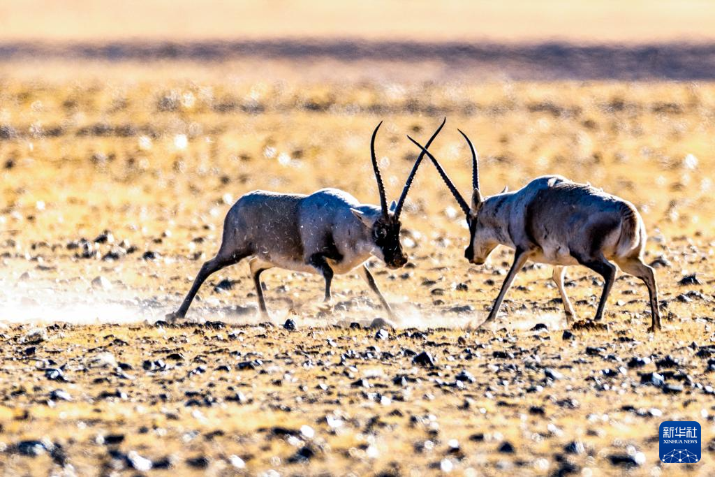 兩頭雄性藏羚羊在羌塘國(guó)家級(jí)自然保護(hù)區(qū)爭(zhēng)奪交配權(quán)(12月3日攝)。新華社記者 姜帆 攝
