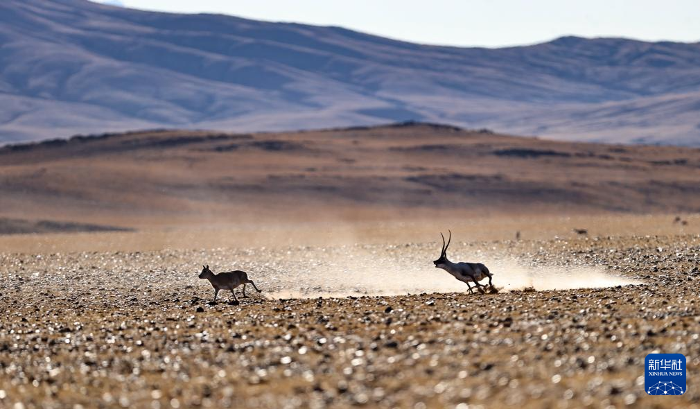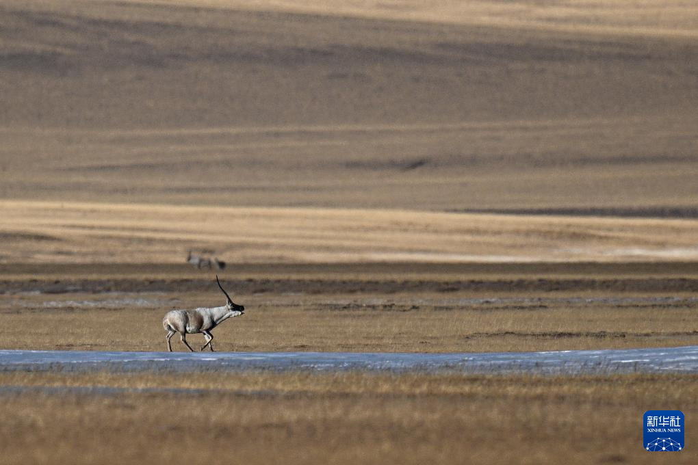 一頭雄性藏羚羊在羌塘國(guó)家級(jí)自然保護(hù)區(qū)的草原上追逐雌性藏羚羊(12月3日攝)。新華社記者 姜帆 攝