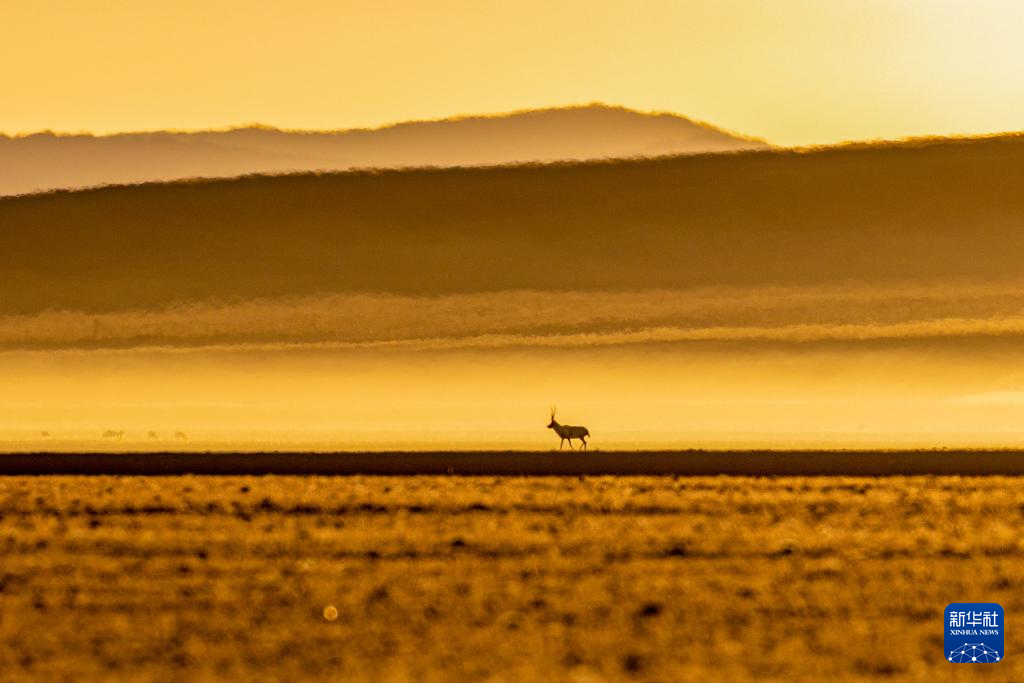羌塘國(guó)家級(jí)自然保護(hù)區(qū)的一頭雄性藏羚羊沐浴在晨光中(12月4日攝)。新華社記者 姜帆 攝