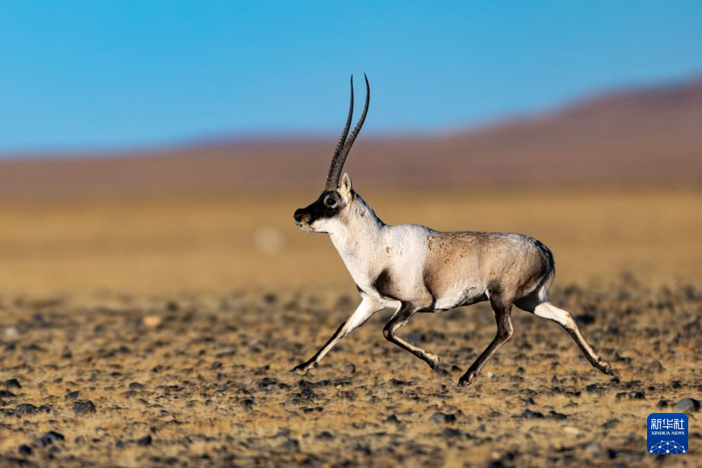 一頭雄性藏羚羊在羌塘國(guó)家級(jí)自然保護(hù)區(qū)的草原上奔跑(12月4日攝)。新華社記者 姜帆 攝