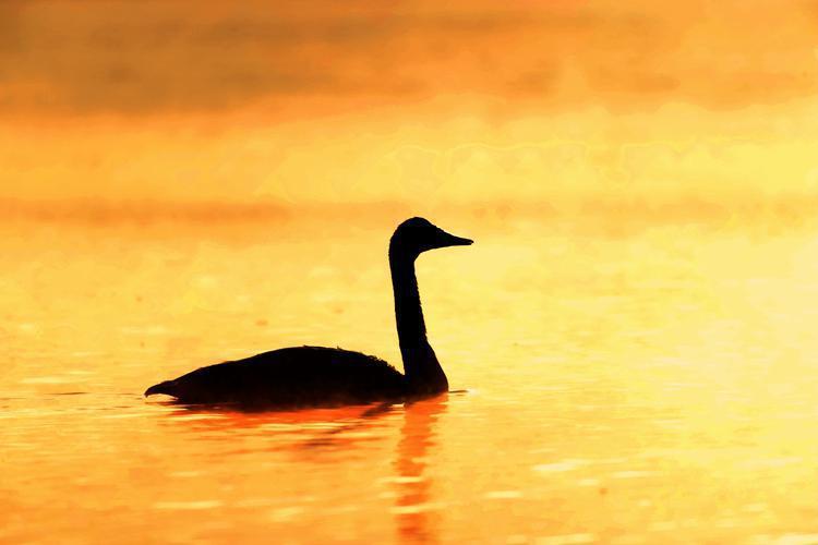 他的相機里,大天鵝們縮著腦袋在晨霧中睡覺、在晨光中展翅,在夕陽下悠哉悠哉游蕩在湖面。