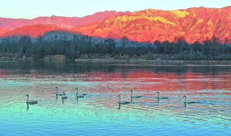 它們羽色潔白、形態(tài)優(yōu)雅,猶如高傲的舞者,在黃河河道中或靜靜游弋或翩躚起舞,為冬日的黃河增添動人的旋律。