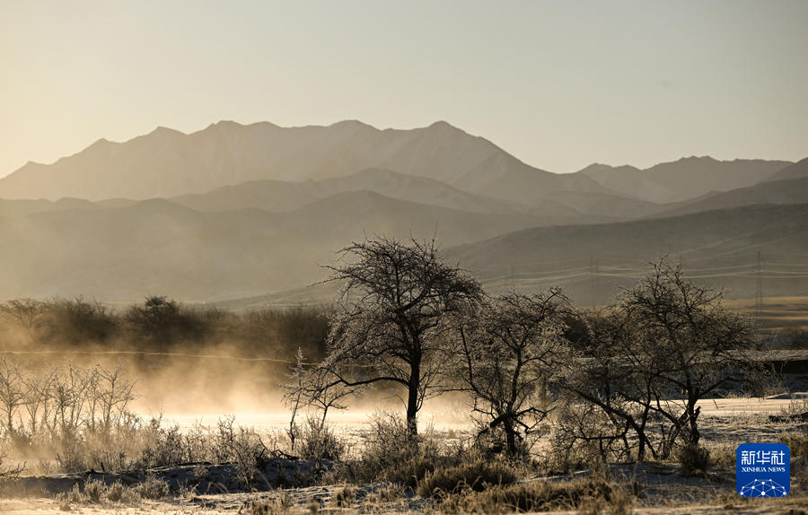 冬日時(shí)節(jié),青海省海北藏族自治州祁連縣出現(xiàn)霧凇景觀,與祁連山的日出相映成趣,美如畫卷。