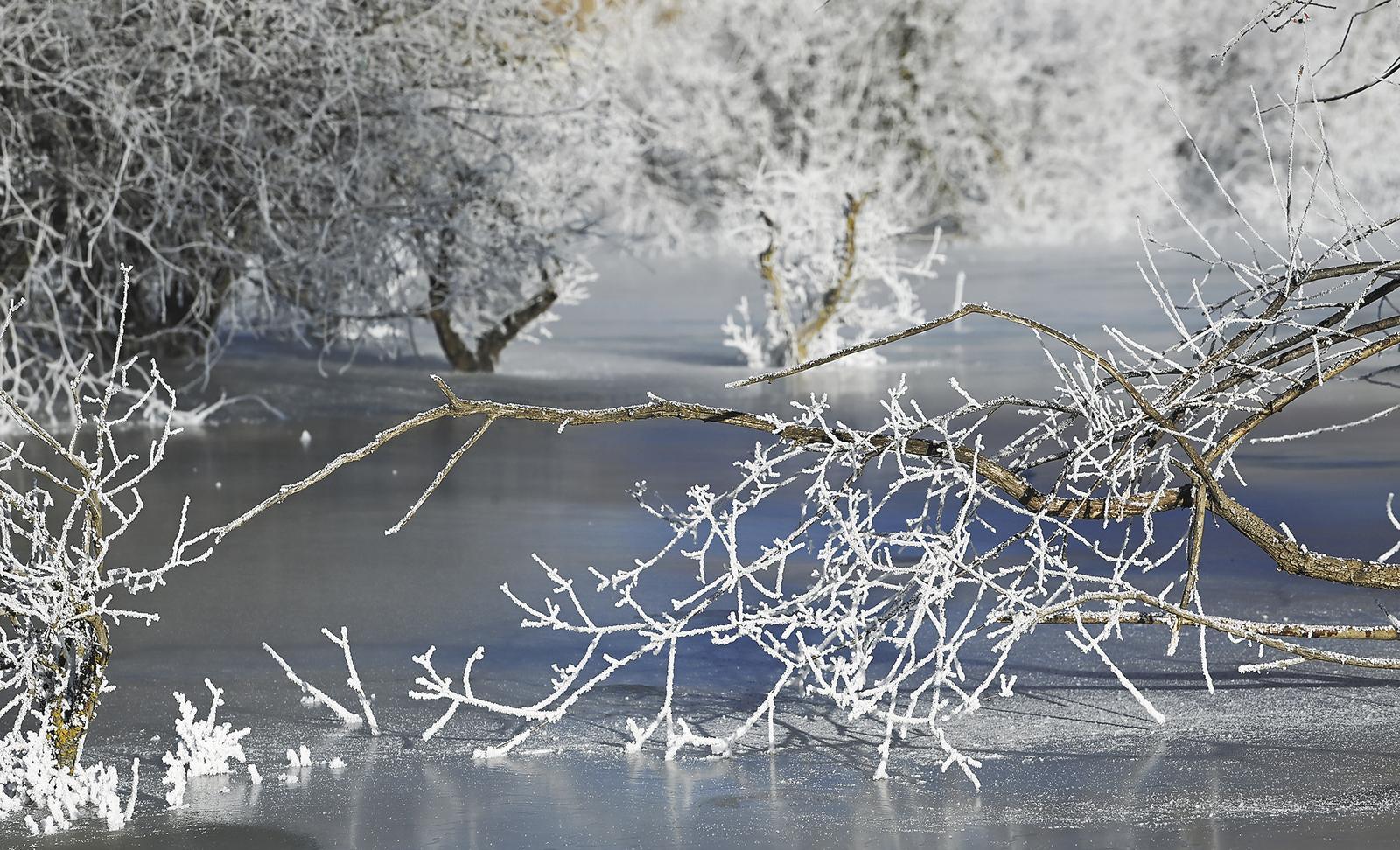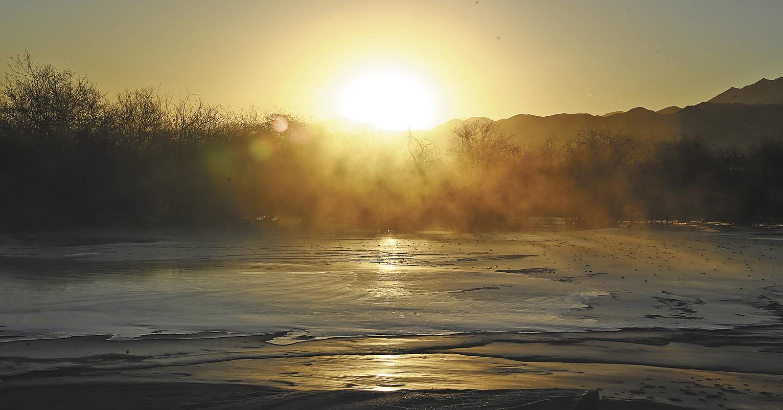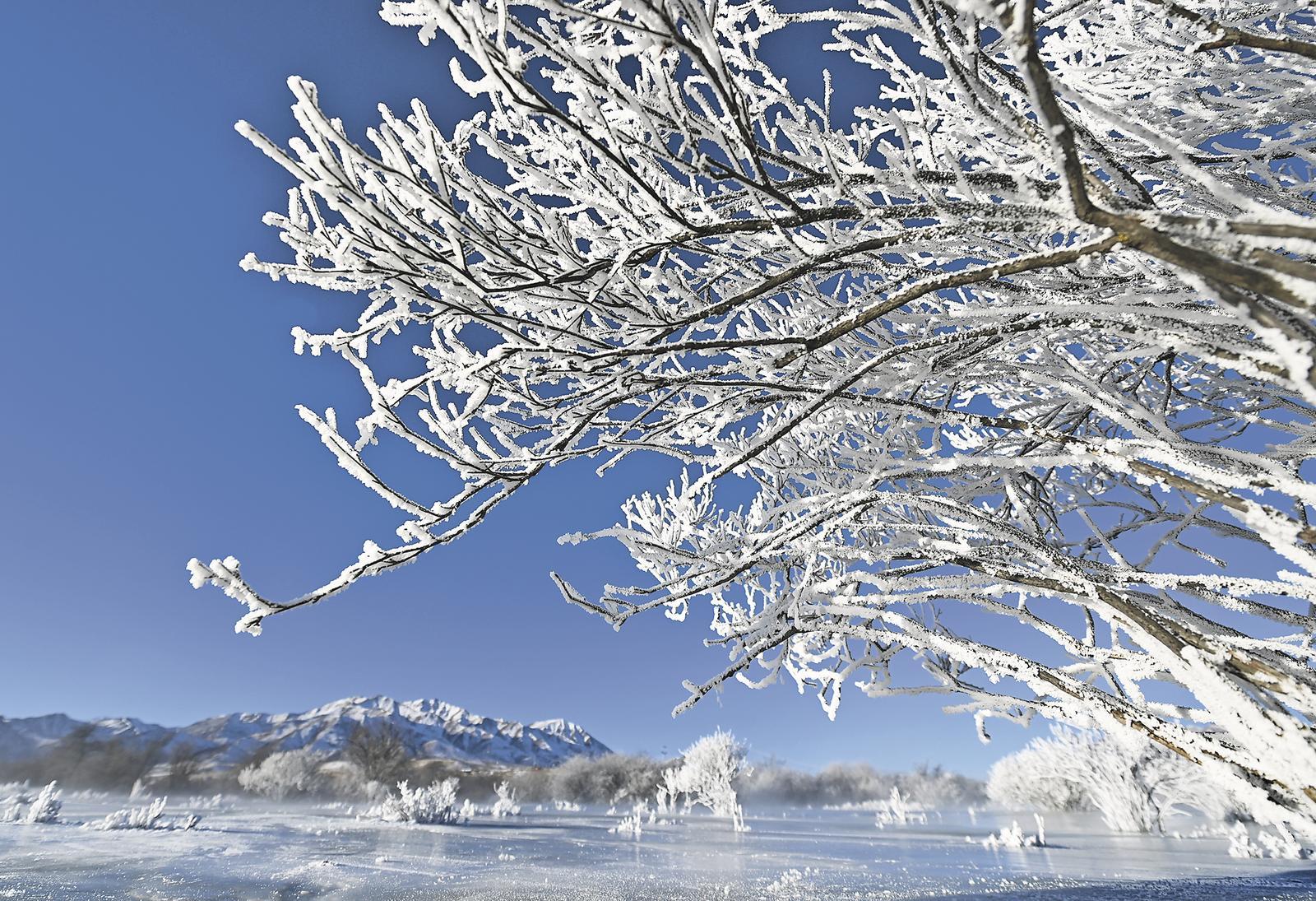 三九寒冬,清晨時分,未完全封凍的河谷蒸騰起氤氳水汽,在零下二十?dāng)z氏度以下的低溫中凝華,給樹枝裹上一層晶瑩剔透的冰晶。陽光穿透晨霧,冰晶折射出五彩光澤,與蜿蜒河流冰面、遠(yuǎn)處祁連雪峰相映成畫,漫步其間仿佛闖入童話世界。