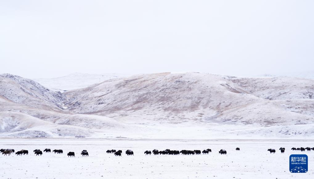 1月29日,一群牦牛在青海省玉樹藏族自治州雜多縣境內(nèi)的草原上覓食。新華社記者 齊芷玥 攝