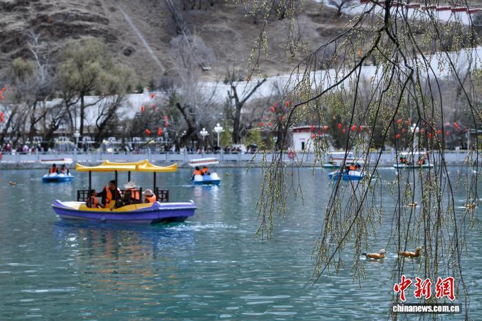 3月8日,西藏拉薩宗角祿康公園,市民乘游船賞春。陽春三月,古城拉薩楊柳發(fā)芽、桃花初放,春意漸濃。中新社記者 貢嘎來松 攝