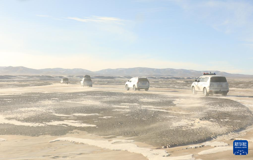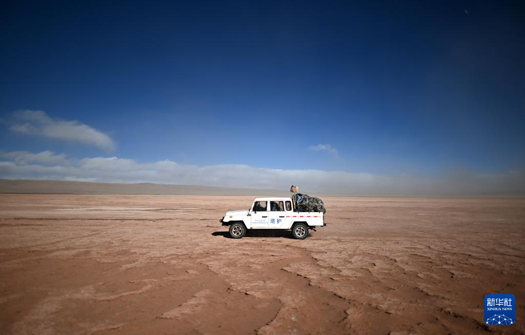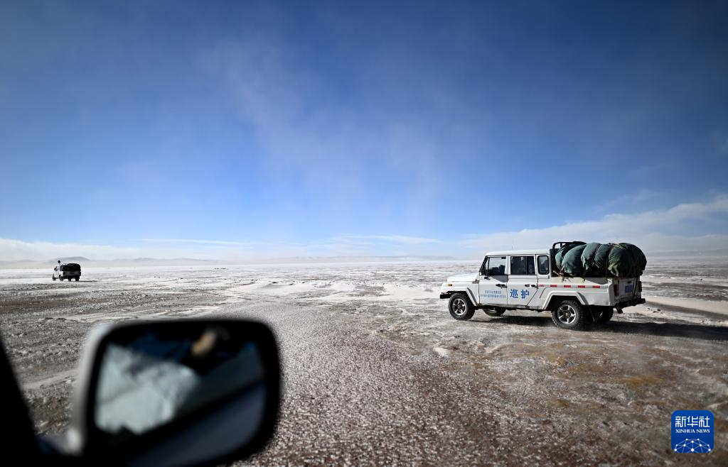 在可可西里卓乃湖區(qū)域附近,可可西里森林公安局巡山車輛在巡查途中(1月19日攝)。新華社記者 李占軼 攝
