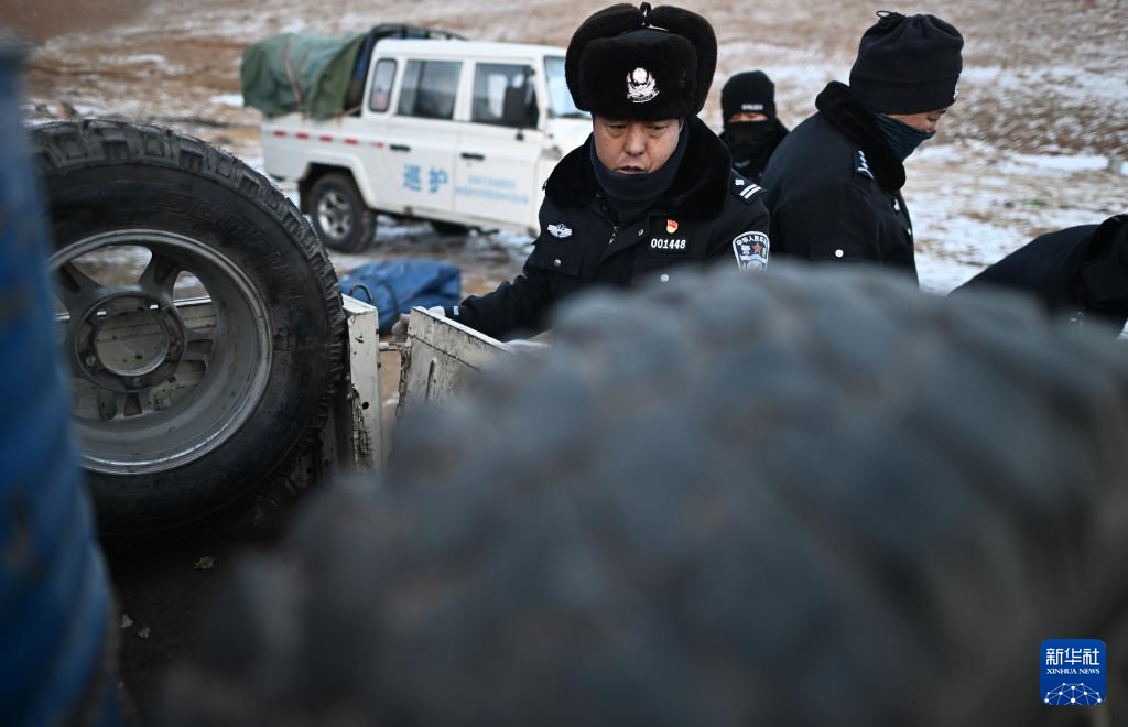 在可可西里可考湖區(qū)域附近,可可西里森林公安局不凍泉派出所所長詹江龍(左一)準備搬運生活物資(1月19日攝)。新華社記者 張宏祥 攝