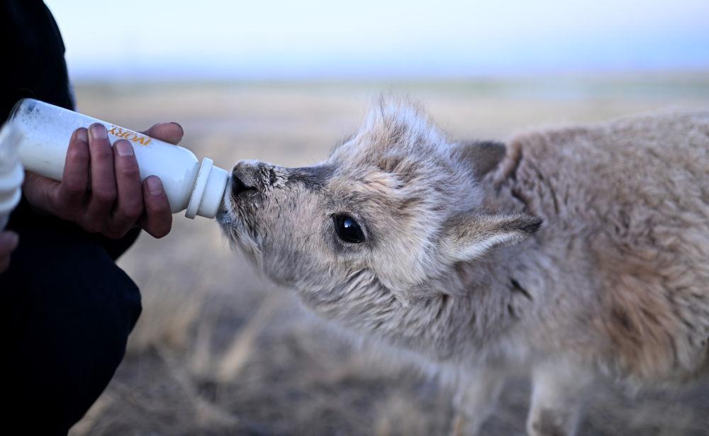 可可西里巡山隊(duì)員才文多杰在索南達(dá)杰保護(hù)站內(nèi)給被救助的藏羚羊幼仔喂奶(1月18日攝)。新華社記者 張宏祥 攝