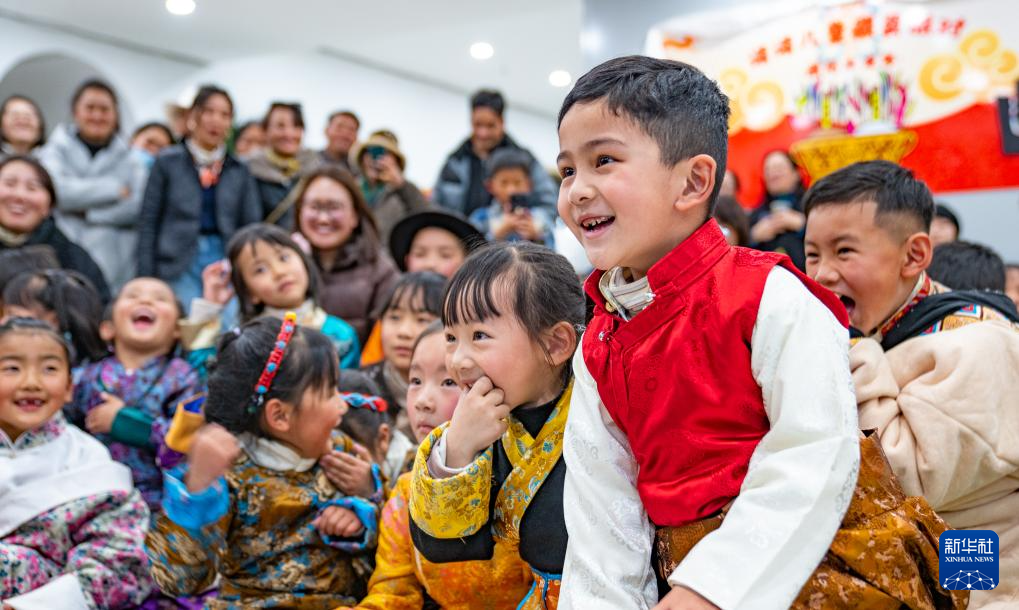 2月3日,孩子們?cè)诶_的兒童藏裝派對(duì)上跳鍋莊舞。新華社記者 丁增尼達(dá) 攝