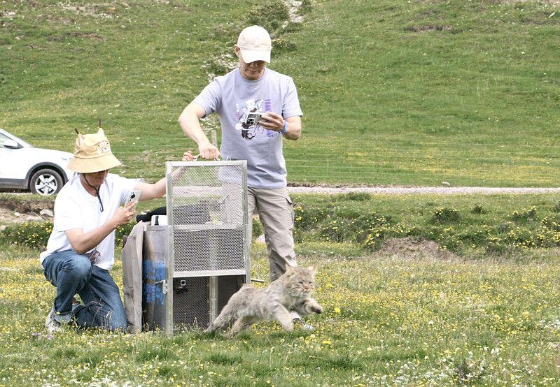 2023年7月23日,在青海省海北藏族自治州海晏縣,西寧野生動物園副園長齊新章(左一)和中國農業(yè)大學動物醫(yī)學院副院長金藝鵬放歸荒漠貓“黃太急”。(西寧野生動物園供圖)