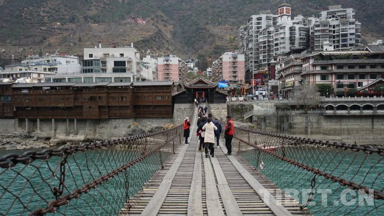 圖為西橋頭視角瀘定橋,游客在中間三條木板通行,救生員在兩側的木板保護游客安全 攝影:張宇