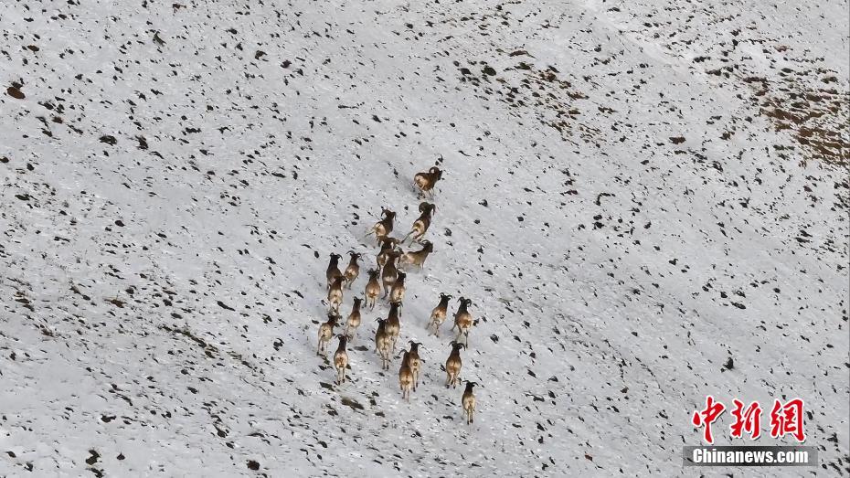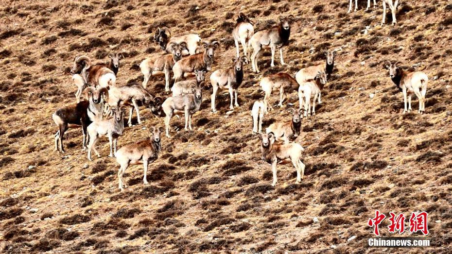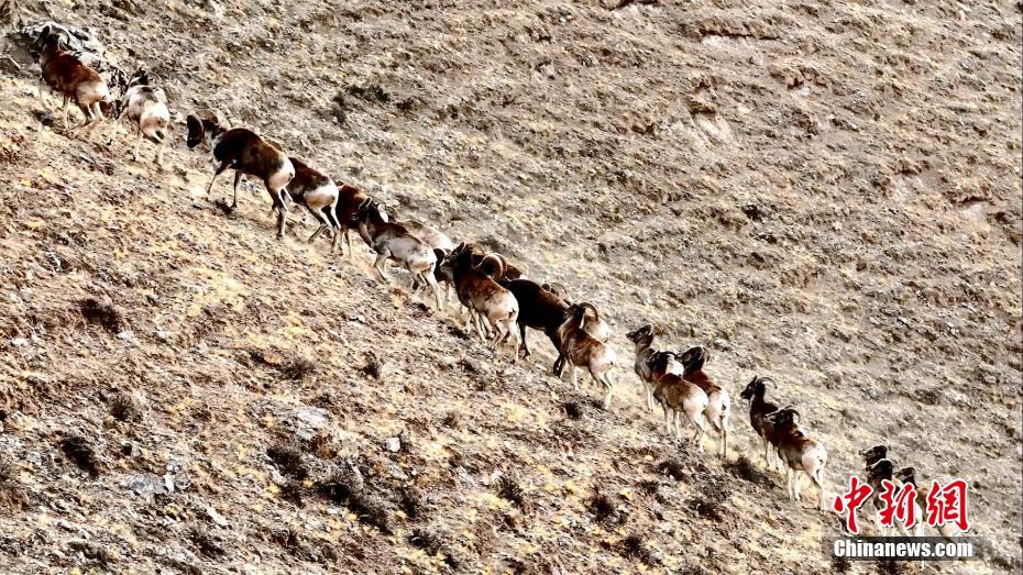 高原春日,天氣轉(zhuǎn)暖。近日,在青海省果洛藏族自治州瑪多縣境內(nèi),生態(tài)攝影師拍攝到成群盤羊翻山越嶺,上演著“飛檐走壁”的絕技。畫面中,金黃的草原和潔白的積雪相互交織,20多只盤羊在山峰間奔馳,雄性盤羊標(biāo)志性羊角仿佛頭頂著“大波浪”,矯捷身姿令人驚嘆,展現(xiàn)野性之美。