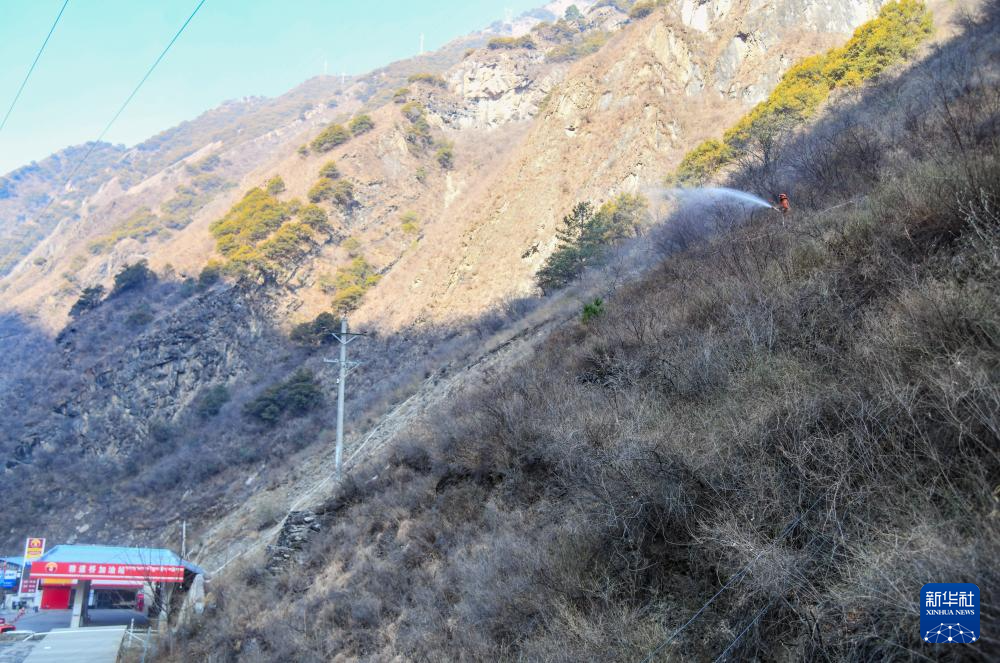 3月18日,消防員在雅江縣雅道橋加油站旁進(jìn)行增濕作業(yè)。新華社記者 王曦 攝
