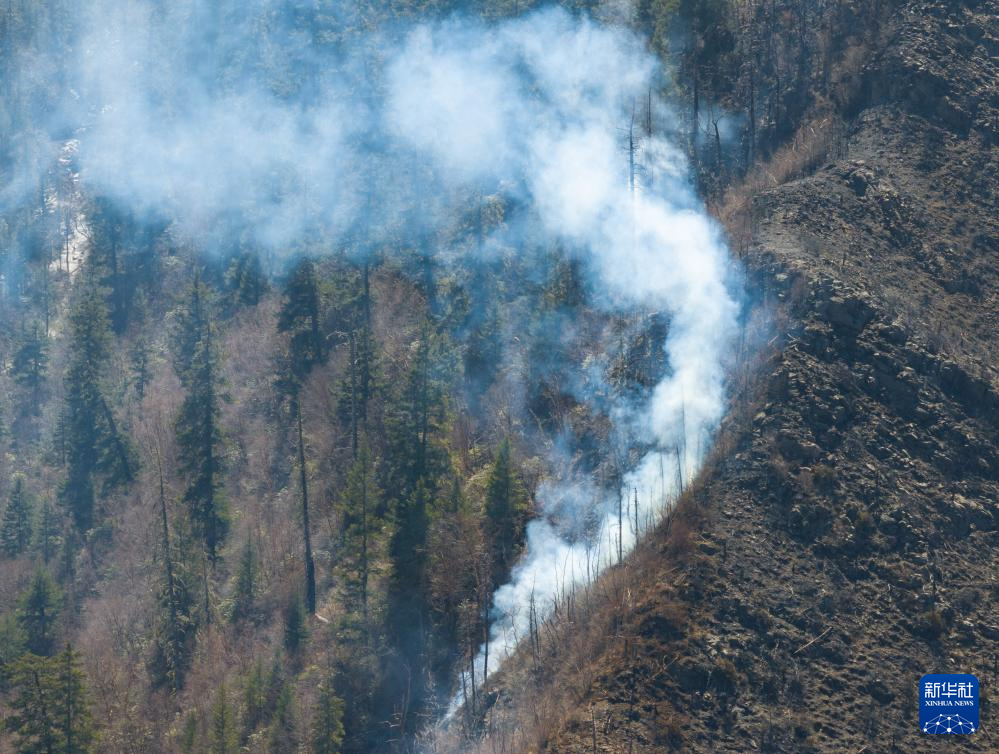 3月18日拍攝的康定市沙德鎮(zhèn)森林火災(zāi)現(xiàn)場(chǎng)(無(wú)人機(jī)照片)。新華社記者 江宏景 攝