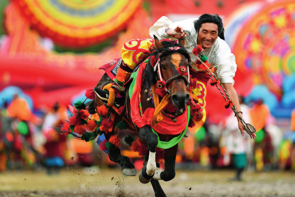 當(dāng)?shù)厝罕娫谟駱洳刈遄灾沃莩闪?0周年慶祝大會(huì)上表演傳統(tǒng)賽馬(2021年8月4日攝)吳剛 攝刊