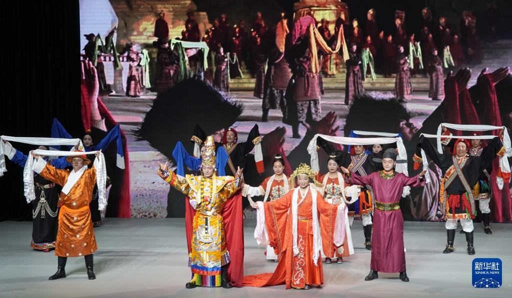 來(lái)自青海玉樹(shù)藏族自治州嶺格珠民間歌舞團(tuán)的農(nóng)牧民演員在表演民族團(tuán)結(jié)進(jìn)步短劇《唐蕃古道》(5月13日攝)。新華社記者 李欣 攝