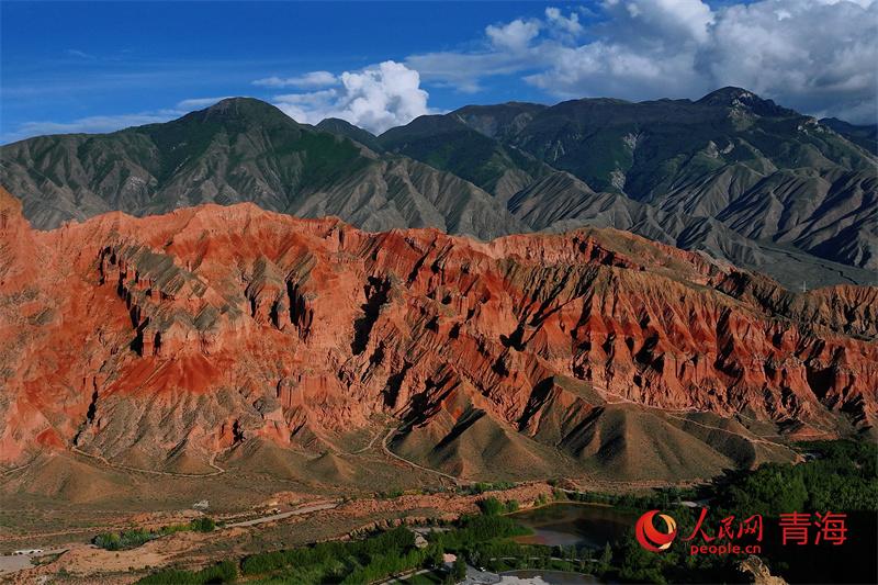 一場雨后,青海貴德國家地質(zhì)公園的丹霞山洗去了塵埃,深深淺淺的紅,在陽光下顯得熱烈而奔放。從空中俯瞰,連綿起伏的紅色山巒, 似是大自然用無盡詩意繪就的一幅畫卷,色彩斑斕而富有想象力。