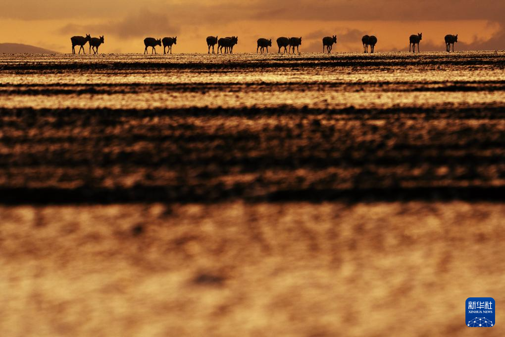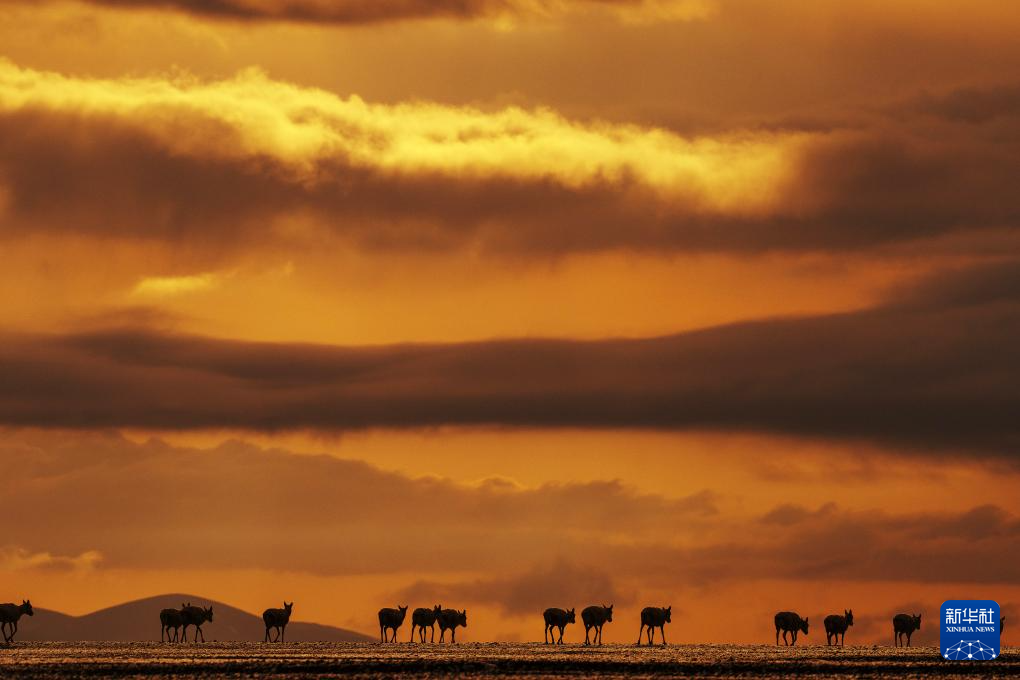 6月14日,在西藏那曲市尼瑪縣境內(nèi)的羌塘國(guó)家級(jí)自然保護(hù)區(qū)“無人區(qū)”深處,一群藏羚羊迎著朝陽,行進(jìn)在遷徙路上。新華社記者 費(fèi)茂華 攝