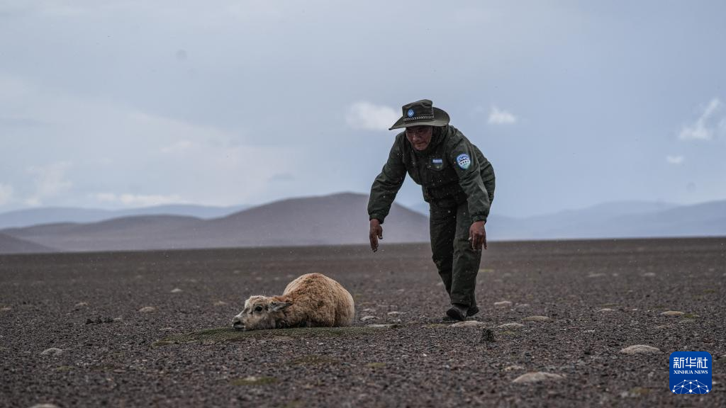 羌塘國(guó)家級(jí)自然保護(hù)區(qū)的野保員上前查看受傷的母藏羚羊(6月14日攝)。新華社發(fā)(旦增攝)