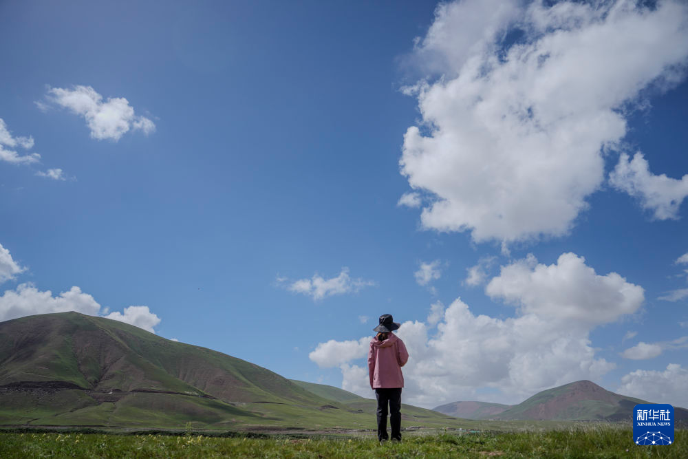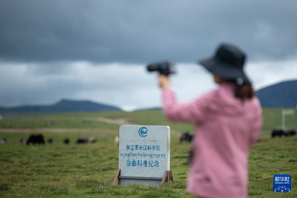 7月23日,長江科學院河流研究所的劉玉嬌站在聶洽曲的草灘上。新華社 杜笑微 攝