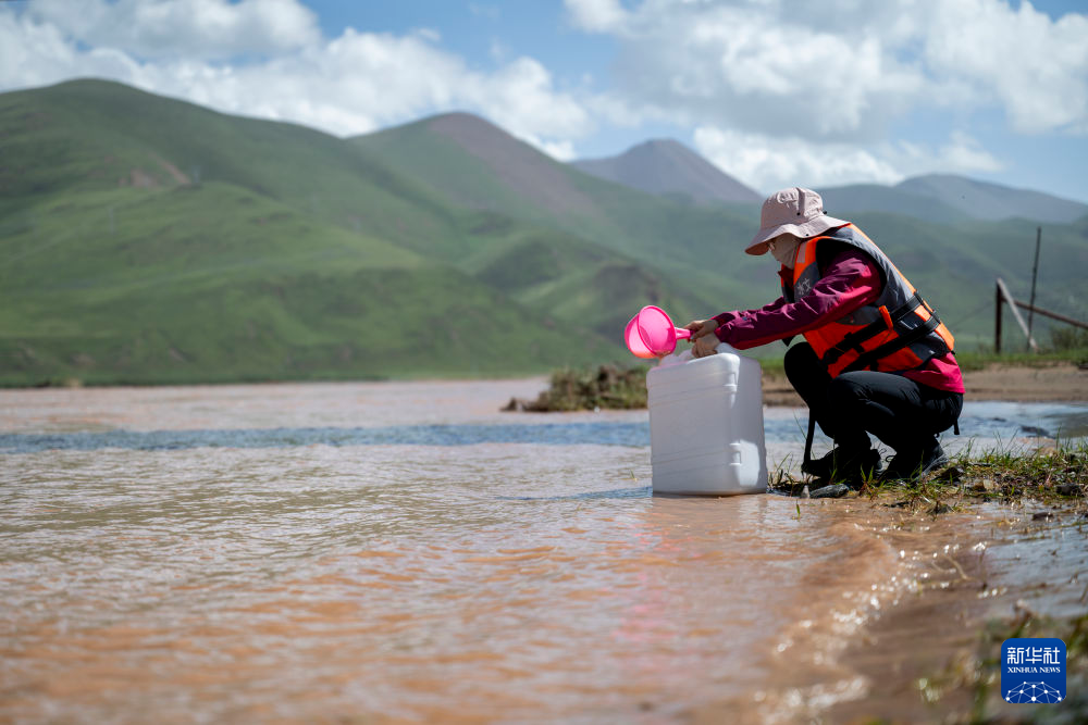 7月23日,青海省水文水資源測報中心的馬蕊在聶洽曲進行水樣采集工作。新華社記者 伍志尊 攝