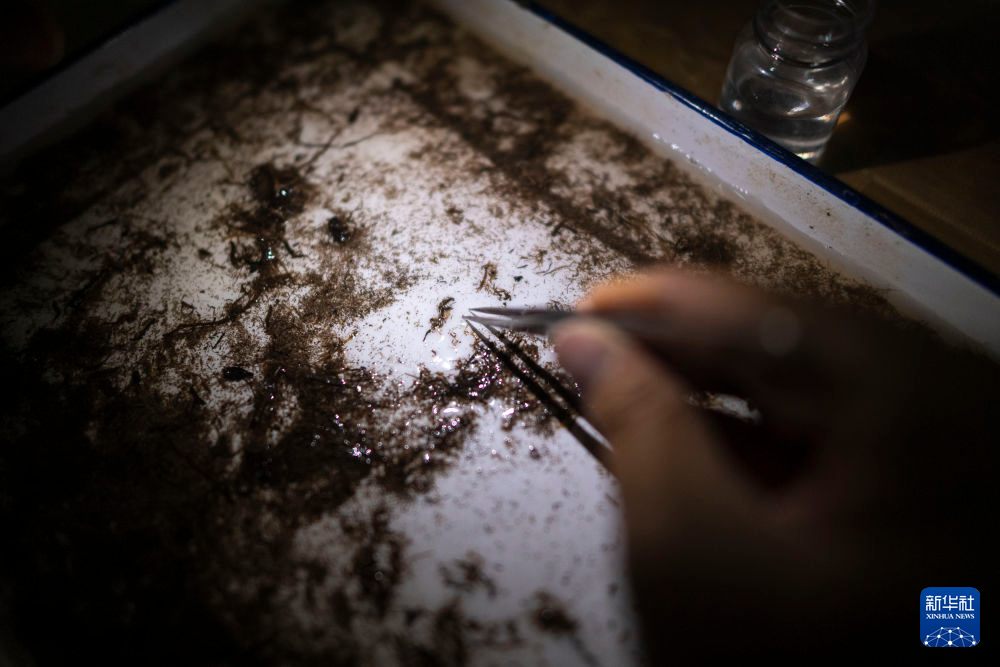 7月24日,在唐古拉山鎮(zhèn)住宿處,科考隊(duì)員連夜進(jìn)行底棲生物挑揀。新華社記者 伍志尊 攝