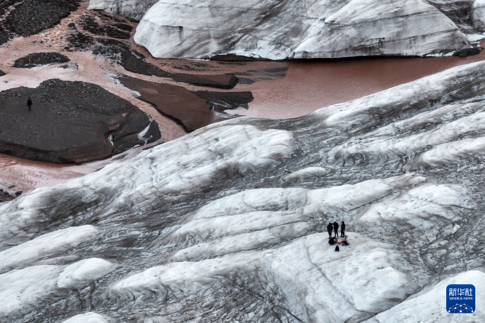 7月25日,在冬克瑪?shù)妆ǎ瓶缄?duì)員在探測冰川(無人機(jī)照片)。新華社記者 伍志尊 攝
