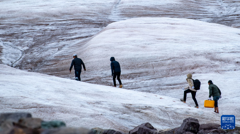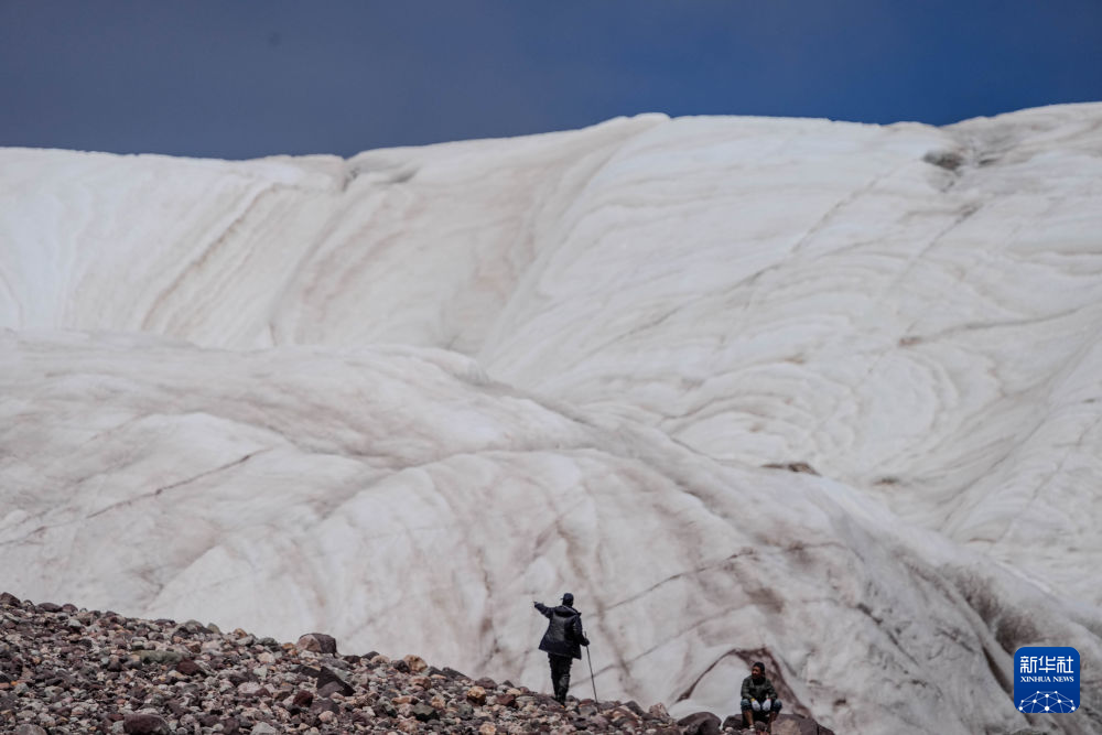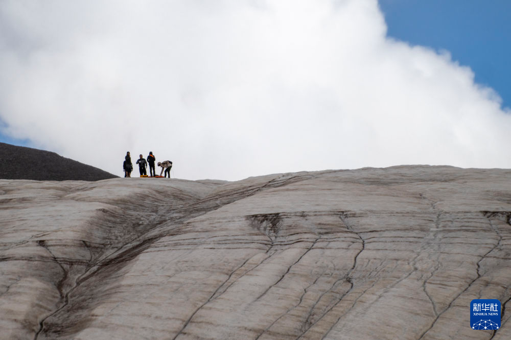 7月25日,在冬克瑪?shù)妆?,科考?duì)員在探測冰川。新華社記者 伍志尊 攝