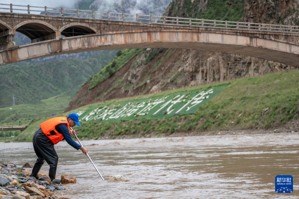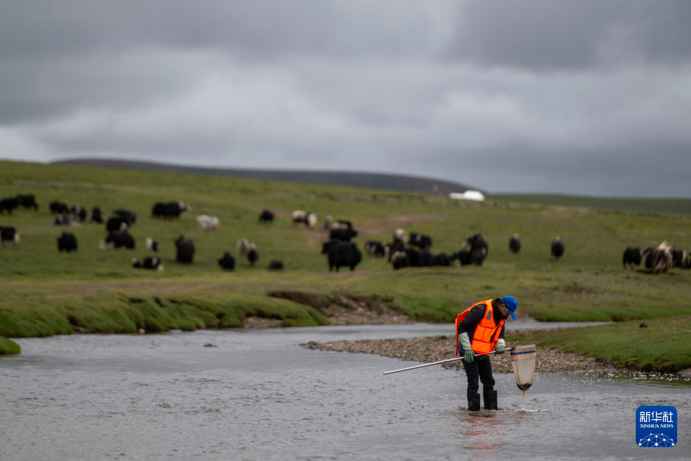 7月25日,在尕爾曲,科考隊(duì)員進(jìn)行底棲生物監(jiān)測采樣。新華社記者 伍志尊 攝