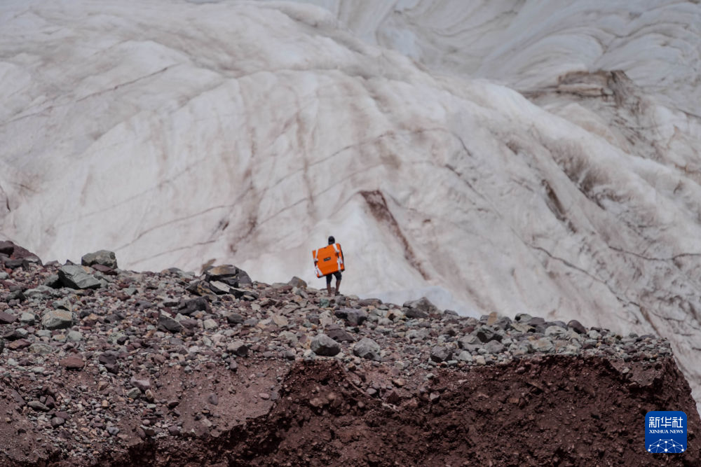 7月25日,在冬克瑪?shù)妆?,科考?duì)員背負(fù)設(shè)備攀爬冰川。新華社發(fā)(杜笑微 攝)