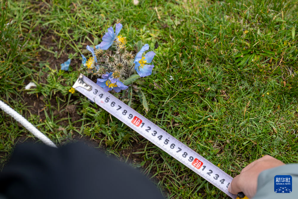7月22日,在當(dāng)曲源,科考隊(duì)員在測量樣方內(nèi)的植物指標(biāo)。新華社記者 伍志尊 攝