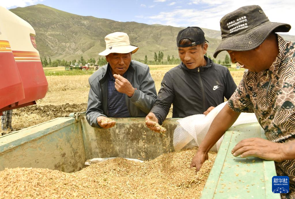 7月31日,山南市扎囊縣扎其鄉(xiāng)朗賽嶺村村民檢查青稞品質(zhì)。新華社記者 張汝鋒 攝
