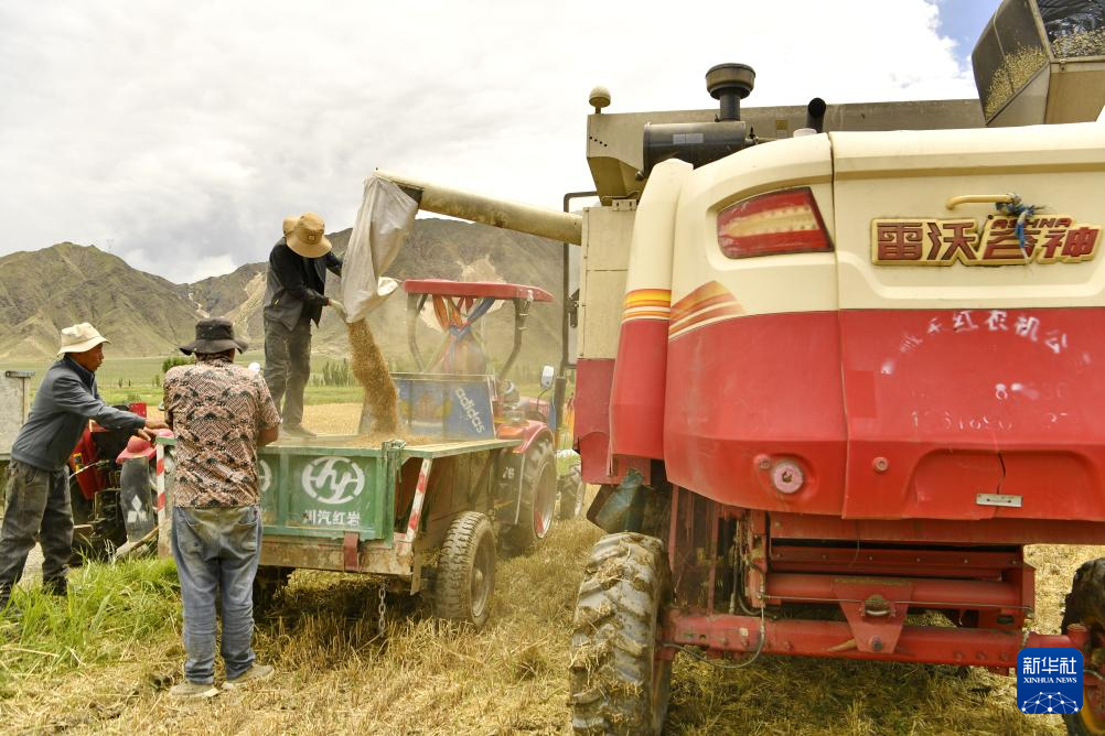 7月31日,聯(lián)合收割機(jī)在山南市扎囊縣扎其鄉(xiāng)朗賽嶺村的農(nóng)田里收割青稞。新華社記者 張汝鋒 攝