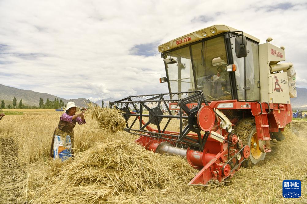 7月31日,聯(lián)合收割機(jī)在山南市扎囊縣扎其鄉(xiāng)朗賽嶺村的農(nóng)田里作業(yè)。新華社記者 張汝鋒 攝