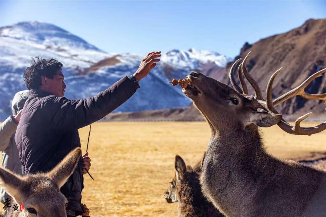 每天,白瑪澤旺就早早地來到管理站,打開倉庫,用袋子將飼料裝好,扛到鹿場。馬鹿一看到他,就會從四面八方圍攏過來,等著他喂食。