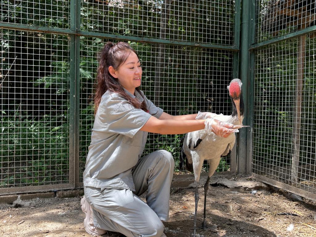 7月3日,西寧野生動物園飼養(yǎng)員李曉清在給黑頸鶴喂食。新華社記者 周盛盛 攝