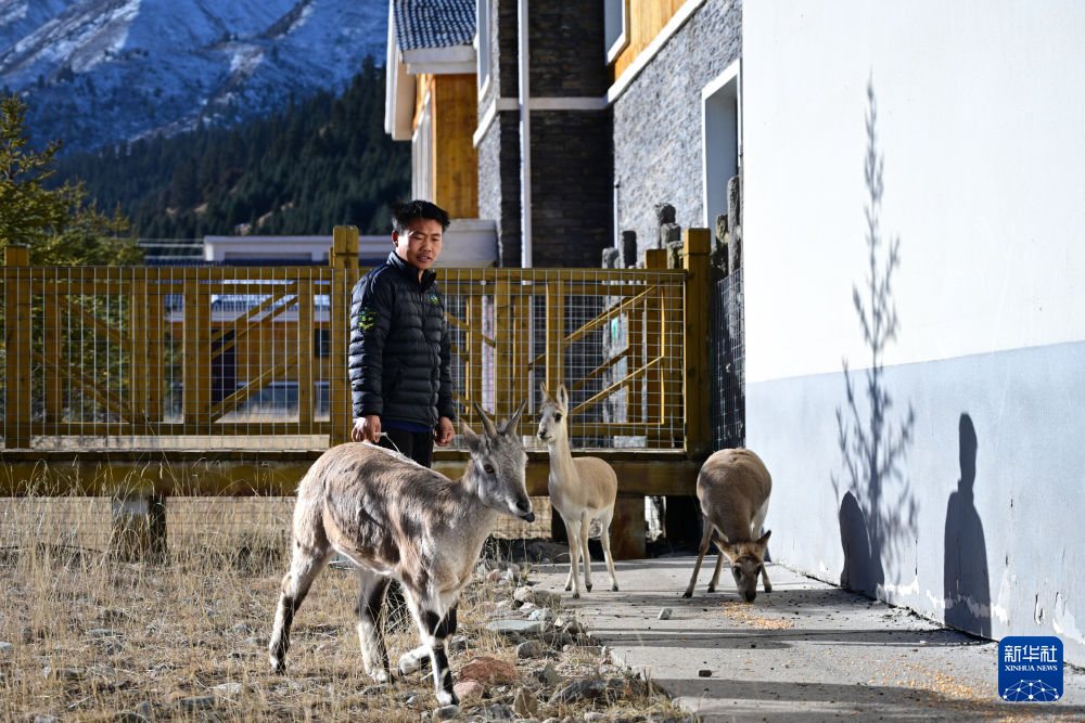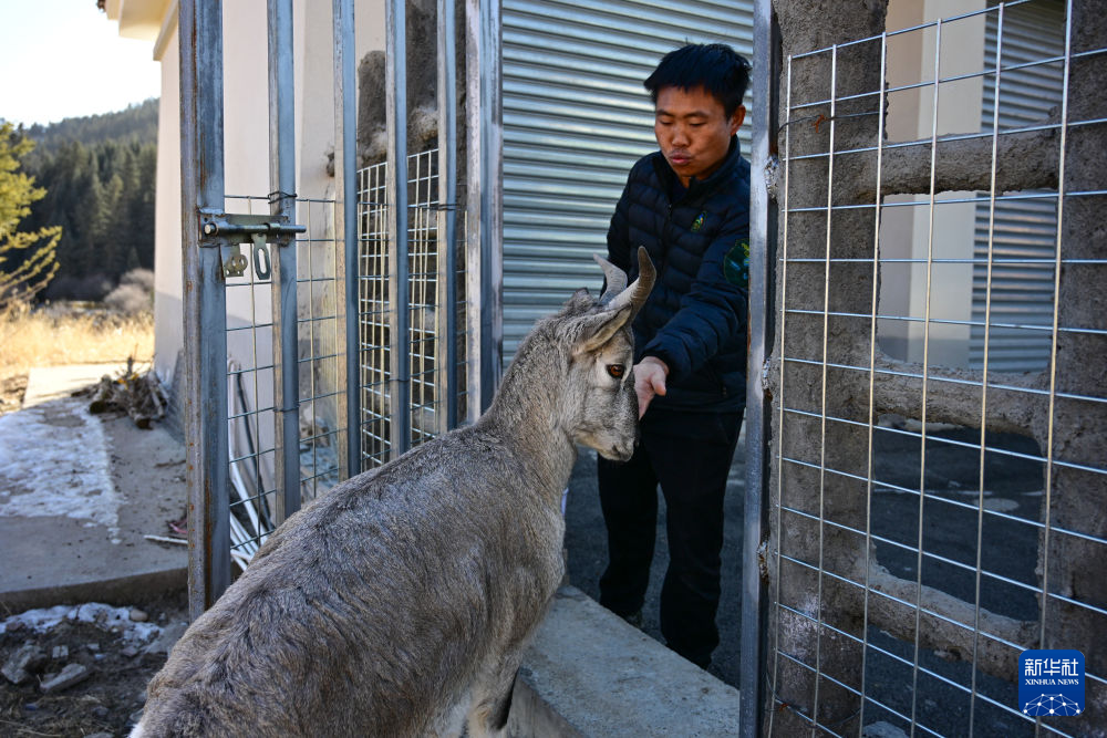 11月10日,在救護繁育站,工作人員劉林春和一只被救助的巖羊互動。新華社記者 齊芷玥 攝