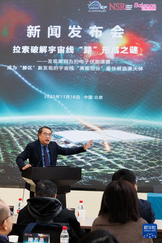 11月16日,在中國(guó)科學(xué)院高能物理研究所舉行的發(fā)布會(huì)上,“拉索”首席科學(xué)家、中國(guó)科學(xué)院高能物理研究所曹臻院士在介紹科學(xué)成果。新華社記者 金立旺 攝