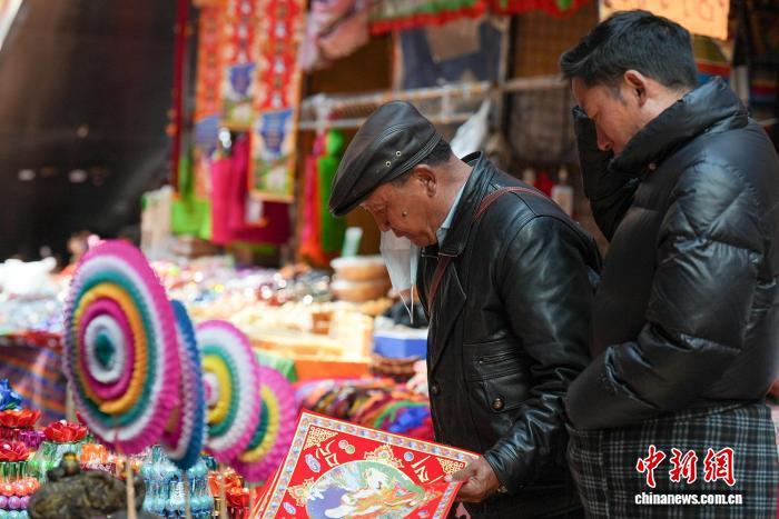 1月27日,藏歷新年將至,拉薩街頭年味漸濃。城區(qū)街巷燈籠高掛,市民忙著采購酥油花、香布、切瑪盒、吉祥羊頭、藏文春聯(lián)等特色年貨,各式新年好物琳瑯滿目,處處洋溢著喜慶祥和的節(jié)日氛圍,人們以傳統(tǒng)方式迎接新年到來。圖為市民在八廓商城選購年貨。貢確 攝