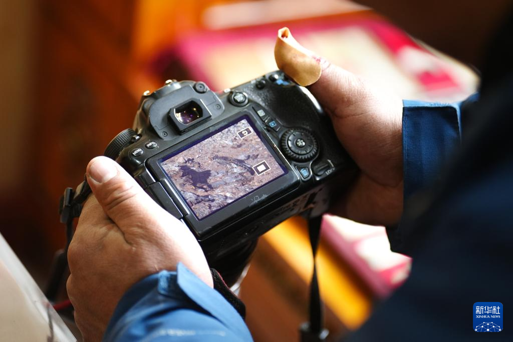 1月29日,次?。ㄗ螅┖透卦谇嗪J∮駱洳刈遄灾沃蓦s多縣昂賽鄉(xiāng)巡護(hù)期間查看拍攝的照片。新華社記者 張龍 攝
