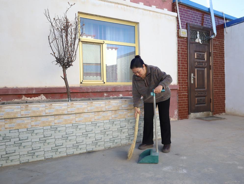 1月22日,長江源村村民小馬正在打掃自家院子。新華社記者 解統(tǒng)強 攝