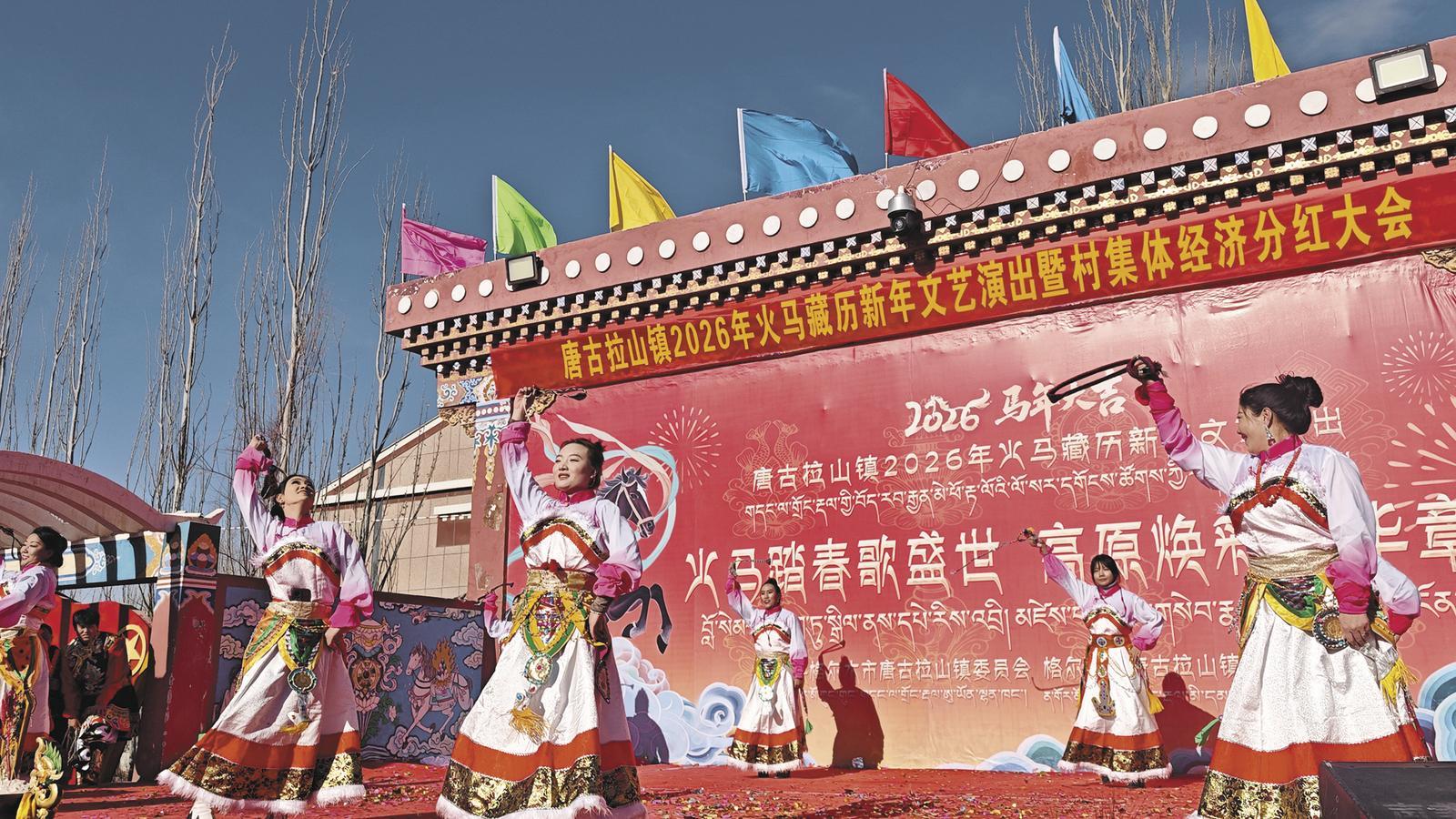 中國藏族網(wǎng)通訊 2月5日,海西蒙古族藏族自治州格爾木市唐古拉鎮(zhèn)洋溢著濃厚的節(jié)日氛圍,2026年火馬藏歷新年文藝演出暨村集體經(jīng)濟分紅大會在這里舉行。村民身著絢麗民族服飾,以一場精彩紛呈的文藝盛宴共迎佳節(jié)。隨后舉行的村集體經(jīng)濟分紅大會,將活動推向高潮。2025年,唐古拉鎮(zhèn)全鎮(zhèn)7個行政村集體經(jīng)濟收入338.25萬元,同比增長21.53%。集體經(jīng)濟持續(xù)壯大,讓發(fā)展成果惠及每位村民,切實提升了人民群眾的獲得感、幸福感與安全感。