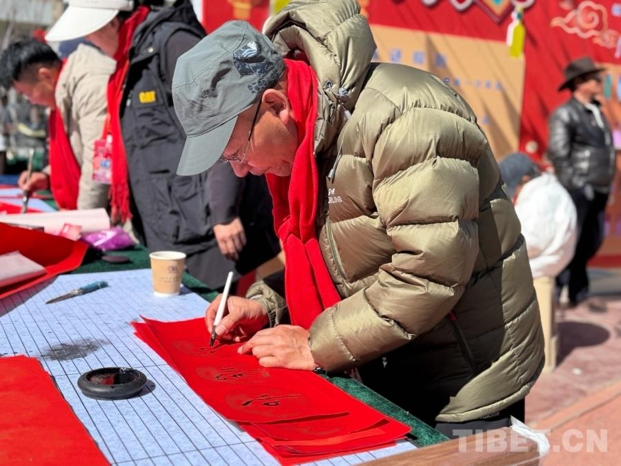 活動現(xiàn)場,一條懸掛著串旗與紅燈籠的燈謎長廊格外引人注目,紅火喜慶的布置映襯著村民們歡快的笑臉。在藏文書法寫對聯(lián)區(qū)域,書法非遺傳承人及資深愛好者揮毫潑墨,為鄉(xiāng)親們免費書寫滿載吉祥祝福的春聯(lián)。非遺技藝展示區(qū)則匯聚了來自奪底鄉(xiāng)及周邊地區(qū)的多位傳承人,通過現(xiàn)場講解、技藝演示和互動體驗,生動展示了藏香制作、氆氌編織、唐卡繪制(小幅)、藏式木雕等富有民族特色的非遺項目,讓觀眾近距離感受到西藏傳統(tǒng)文化的魅力?!?/p>