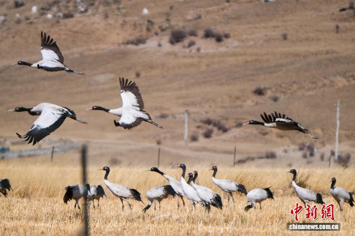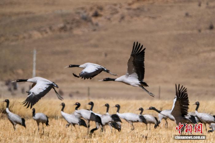 黑頸鶴是中國國家一級保護動物,是唯一生活、繁殖在高原的鶴類,被藏族民眾譽為“吉祥鳥”。近日,西藏自治區(qū)拉薩市林周縣林業(yè)和草原局介紹,作為黑頸鶴重要的越冬棲息地,今年該縣境內(nèi)黑頸鶴數(shù)量在1800只至2300只之間,其中虎頭山水庫卡東村一帶占比約一半。中新網(wǎng)記者在周邊看到,不少黑頸鶴在田間覓食,不時飛翔于高原農(nóng)田、村落上空,舞動的鶴影和聲聲鶴鳴為冬春時節(jié)的高原增添了幾分靈動。圖為2月8日,黑頸鶴群在悠閑覓食。江飛波 攝