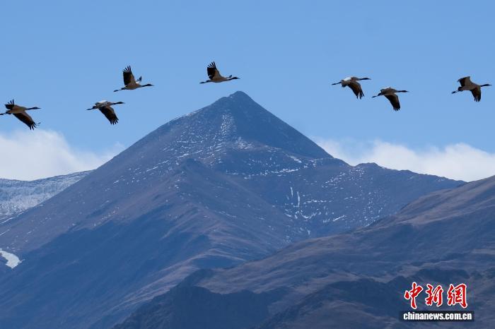 圖為2月8日,黑頸鶴群飛翔于高原。江飛波 攝