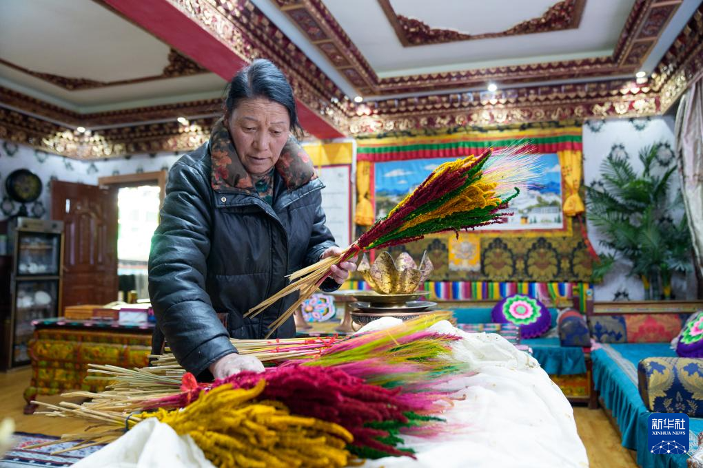 2月16日,在拉薩堆龍德慶區(qū)東嘎街道桑木社區(qū),群群的妻子扎桑在整理“羅薩美朵”。新華社記者 丁增尼達 攝