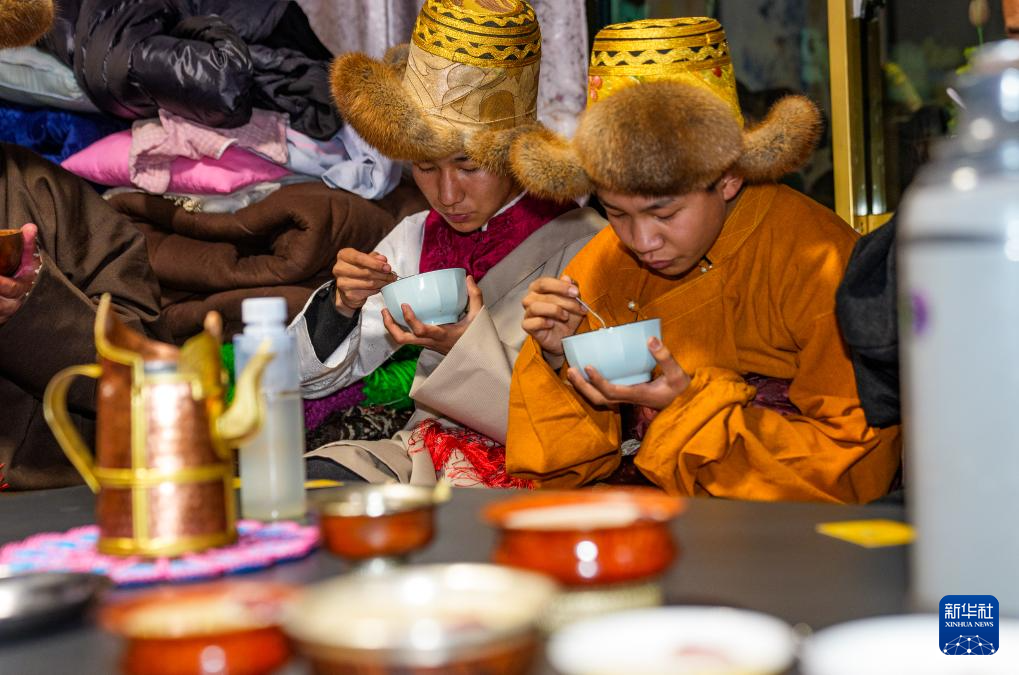2月16日,在拉薩堆龍德慶區(qū)東嘎街道桑木社區(qū),群群一家人在吃“古突”。新華社記者 丁增尼達 攝