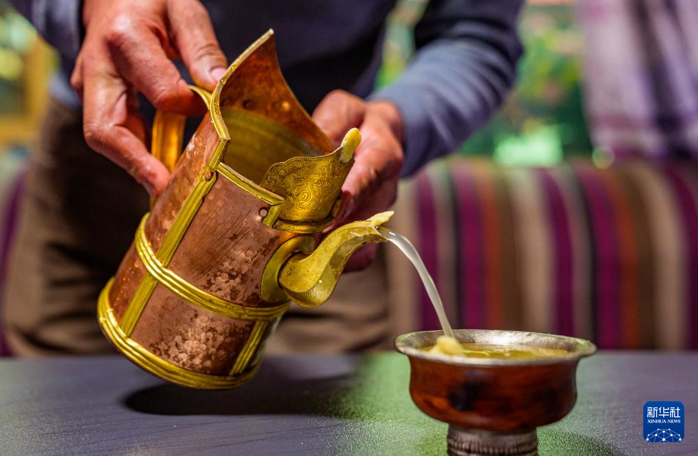 2月16日,在拉薩堆龍德慶區(qū)東嘎街道桑木社區(qū),群群在倒青稞酒。新華社記者 丁增尼達 攝